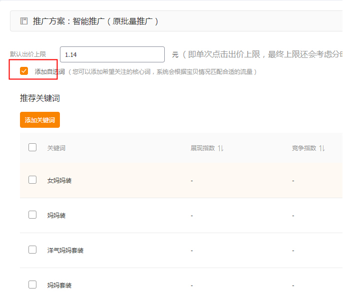 这一步,看好了可以自主添加关键词,系统默认是不开启的,建议打开自主添加词,在利用系统添加的词里面来测试好词的同时可以人为干预的添加自己认为跟宝贝相关或者还不错的词。