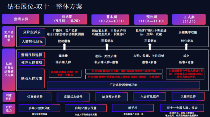 根据顾客不同时期的诉求,商家的营销目标也不一样,前战期主要通过广撒网,顾客拉新结合日常营销活动测款测图做钻展投放,主要是拉潜在顾客为主。