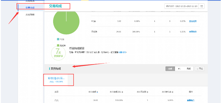 我们店铺的主营类目占比是要明确的,如果店铺同时存在多个类目产品经营,这会导致我们后期店铺流量冲突以及人群的不准确,所以我们可以在生意参谋,交易构成,查看我们店铺的主营类目占比是什么,并且核对我们店内的商品是否有放错类目,不要引起系统检测从而导致违规处罚。类目的属性如何,这个我们可以利用市场洞察来查看整个类目行业大盘的趋势,分析我们的店铺接下来的操作方向,比较各项属性值选择较好的属性值。