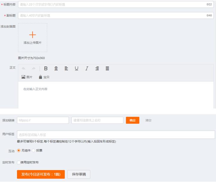 标题内容和副标题必填项,标题22个字,副标题40个字,都不能还有违禁词。然后上传图片。图片大小是702x360,图片要清晰有看点。接下来把写好的内容放入正文。正文下面的链接添加我们关联产品的链接和产品的品名。用户标签一项,要填跟我们产品和定位相关的词,精准的词,不是越多越好。在下面就是关于互动,默认只有投票,7月底微淘会更新,会增加更多的功能,当然也可以购买一些组件,实现不同的功能。关于组件要跟大家重点说一下,大家在服务市场可以搜索“组件”,会有很多微淘的组件,虽然会收费,一个月也就十多元,但是可以实现好多功能,相当超值的。当然新品的打造一个新品的销量及流量计划至关重要,这个是打造爆款很重要的,不会做计划的可以加文章最后的旺旺群,联系群主送你。