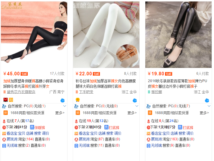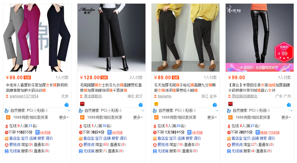 很明显,是左边第二张,因为消费者搜索的是“加绒裤女”,他希望看到的是一条加绒的裤子,虽然以上三个产品标题都有“加绒”,但是只有左边第二张主图展示了加绒,其他三张只是简单的展示产品的款式,很明显不符合消费者第一需求。