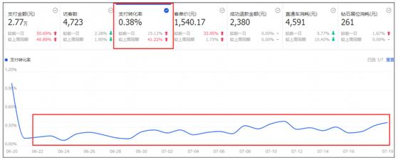 看这个店铺的转化率,最高点是618大促的时候,其他的时间都会比较稳定的。如果你的店铺,综合支付转化率出现了持续下滑的时候,那必须要去找原因了,比如流量不精准了,出现了强力竞争对手了等等,然后去想应对的策略。