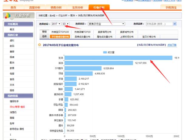 当然,通过这些我们只是粗略的找出类目,比如我们做耳饰的话,到底是做耳钉的,还是做耳线呢,是做925纯银的还是做99足银的,还是做镶钻的,还是不镶钻的呢,这些我们都可以去分析,怎么分析呢,同样可以借助淘宝代运营生意经,如下图